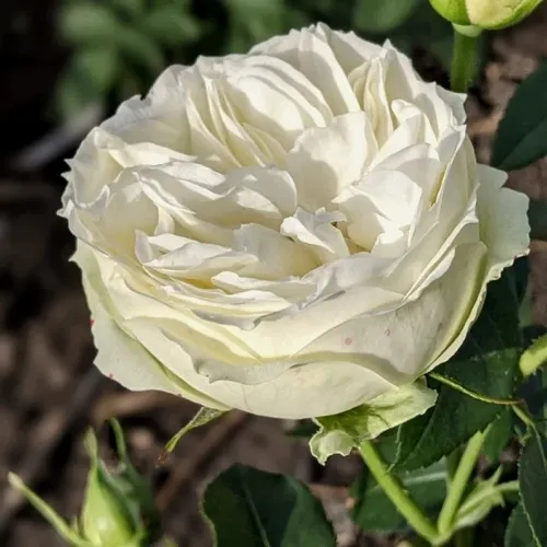 Главная гордость сорта — это его густомахровые цветки с пионовидной структурой. Один бутон может насчитывать до 80 лепестков, что придает цветку роскошный, насыщенный объем. Диаметр раскрытого цветка достигает 8–10 см. Цвет лепестков — чисто-белый, с мягким кремовым подтоном, особенно заметным при рассеянном свете. Цветение начинается в конце мая и продолжается с повторными волнами до поздней осени. Цветки чаще одиночные, реже — по два-три на прочном цветоносе. Аромат лёгкий, едва уловимый, с нотами зелени и фруктов — он не навязчив, но приятен и подчеркивает утонченность сорта.