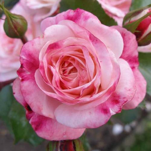 Розы Розенштадт Фрайзинг привлекают внимание не только своим размером, но и необычной окраской. Бутон насыщенного бордово-красного цвета с кремовыми полосками, напротив ярко белого цветка с красным краем, создает фееричное сочетание. По мере распускания на лепестках появляются красные штрихи и розовые потеки, что дополнительно подчеркивает красоту цветка. Цветы имеют чашевидную форму, компактный размер (до 7-8 см в диаметре) и махровый тип с 30-35 лепестками. Они располагаются как одиночно, так и в соцветиях, причем на каждом стебле может быть от 1 до 3 цветков. Аромат этих роз легкий и ненавязчивый.
